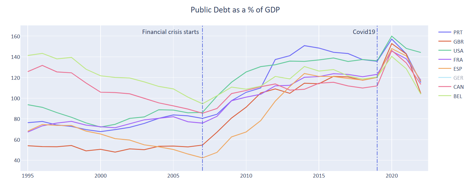 Public debt/GDP ratio changes drastically with external shocks. From: OECD