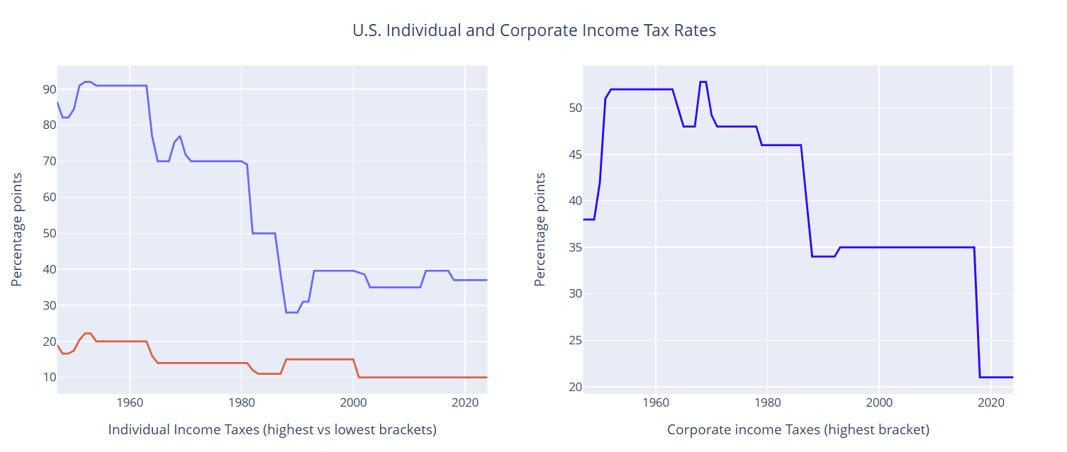 Since the early 1960s, the highest tax brackets for individual and corporate income have dropped dramatically.