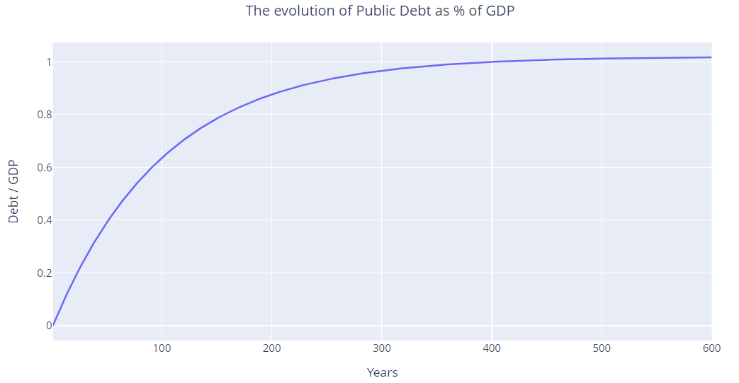 - The real interest ratepaid on public debt \(\left(r_p\right)\). The equation that drives the evolution of public debt as a % of GDP is: \[ d_t=p+\left(\frac{1+r_p}{1+g}\right) d_{t-1} \tag{1} \]