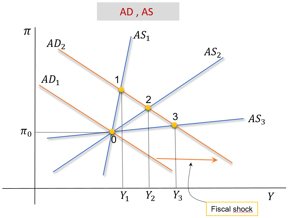 - If the slope AS is intermediate (like AS2), the increase in GDP is more significant than the previous case: from 0 to Y2.